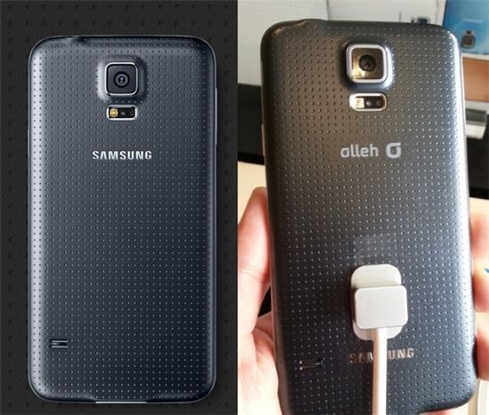 [아시아경제 김영식 기자]이동통신3사를 통해 예정보다 이른 27일에 출시된 갤럭시S5는 지난달 스페인 바르셀로나에서 공개된 글로벌 출시 모델과 사양면에서 차이가 없다. 다만 탈착 가능한 후면 배터리 커버의 경우 중간에 위치한 삼성전자 로고가 하단으로 내려가고 그 자리에 각 이통사별 로고가 들어간다.좌측은 갤럭시S5 글로벌 버전, 우측은 국내 KT 출시 버전.