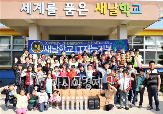 호남대 인터넷콘텐츠학과가 새날학교에 PC를 기증하고 학생들과 기념촬영을 하고있다.
