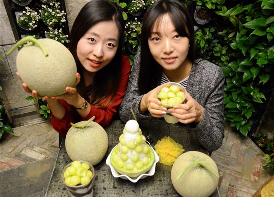 [아시아경제 장인서 기자]30일 신도림 디큐브백화점 5층 카페 도츠(dots)에서 모델들이 메론빙수를 소개하고 있다. 디큐브백화점은 속을 파낸 메론에 부드러운 눈꽃얼음과 동그랗게 모양을 낸 메론 과육을 탑처럼 쌓아올린 메론빙수를 판매 중이다. 다음 달부터는 1인용 메론 컵빙수도 판매한다. 장인서 기자 en1302@asiae.co.kr<ⓒ세계를 보는 창 경제를 보는 눈, 아시아경제(www.asiae.co.kr) 무단전재 배포금지>