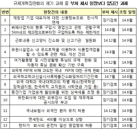 [아시아경제 이경호 기자]정부의 규제개혁의 추진 틀이 30일 확정됐다.규제정책 수립과 시스템 개편은 국무조정실이 총괄하고,개별 규제개선 과제는 소관부처 중심으로 하되 여러 부처 관련 과제는 관계 부처 협업으로 처리하기로 했다. 경제부처와 사회·안전 부처 간에 걸친 과제는 국무조정실장이 주재하는 규제개혁 조정회의 등을 활용해 처리하고 부총리 또는 국조실장 주재 회의에서 해결이 어려운 과제는 총리 주재 관계장관회의에서 해결하기로 했다.지난 20일 박근혜 대통령 주재 규제개혁장관회의와 규제개혁신문고 등에서 제기된 규제개혁 건의과제도 당초 일정보다 앞당겨 해결된다. 이에 따라 자동차 튜닝 규제완화는 올 12월에서 9월로, 뷔페사업자 빵류 구입시 거리제한은 8월에서 6월로 각각 앞당겨진다. ◆정 총리 "핵심 덩어리 규제 직접 해결"=김동연 국무조정실장은 30일 정부서울청사에서 이런 내용을 담은 규제개혁 추진 틀과 실행계획, 과제해결 계획 등을 발표했다. 정홍원 국무총리는 앞서 "각 부처의 규제개혁 작업이 질서있고 효율적으로 실행되기 위한 정부내 체계적인 규제개혁 추진 틀을 구축하라"고 지시하고 "규제개혁장관회의 제기 과제, 손톱 밑 가시, 규제신문고 건의과제 등을 추진체계 틀 내에서 조속히 처리토록하고 국무조정실에서 규제개혁 컨트롤타워를 맡아 진행상황을 철저히 점검할 것"을 당부했다. 정 총리는 특히 "덩어리 규제중 해결이 어려운 과제는 총리가 직접 조정하겠다"는 의지도 밝혔다.정 총리는 또한 "규제개혁장관회의에서 보고된 규제시스템 개편방안에 대한 구체적 실행계획을 확정, 부처에 시달해 각 부처가 준비하는데 차질이 없도록 하라"면서 "아울러 국무조정실이 앞장 서 일선 현장 공무원들의 의식과 일하는 방식을 변화시켜 규제개혁의 실효성을 높일 수 있도록 다각적인 방안을 강구토록 하라"고 지시했다.조기처리 해결 13개 과제[자료=국무조정실]
