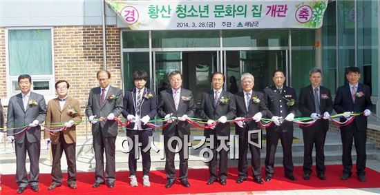 해남군 황산 청소년 문화의 집이 개관했다. 이날 박철한 해남군수 등 참석자들이 개관 테이프를 자르고있다.<br />