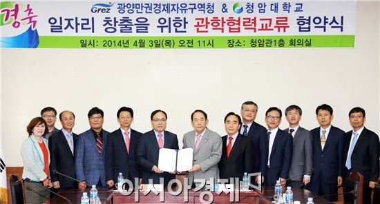 이희봉 광양만권경제자유구역청장은 강명운 청암대학교 총장과 광양만권의 일자리 창출 및 창의적 인재양성을 위해 3일 오전 11시 청암대에서 업무협약 체결식을 가졌다. 사진제공=광양경제청