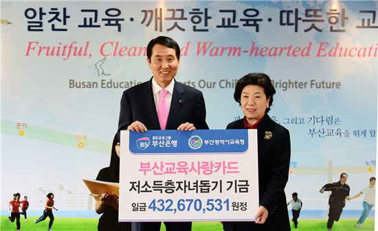 ▲부산은행은 8일 오전 부산광역시 교육청을 방문해 지난해 '부산교육사랑카드' 이용액으로 적립된 '저소득층 자녀돕기 기금' 4억3267만원을 전달했다. 사진 왼쪽부터 성세환 BS금융그룹 회장, 임혜경 부산시 교육감.<br />