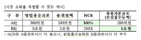 현행 NCR 방식으로는 증권사 규모별 위험흡수능력이 나타나지 않는다는 한계가 있다.