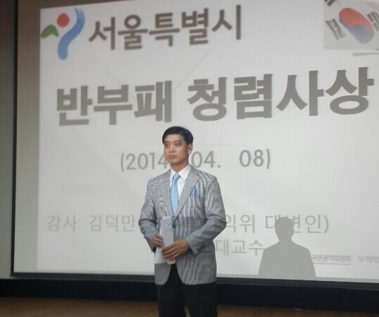 [아시아경제 박종일 기자]청렴교육자인 김덕만 한국교통대 교수(전 국민권익위원회 대변인)가 8일 오후 서울 서초동 서울시 인재개발원에서 시청공무원을 대상으로 청렴교육을 실시했다.김덕만 교수는 이날 '반부패 청렴사상'이란 주제로 강의하면서 "우리나라는 2차 세계대전 이래 지구촌에서 보기 드물게 경제강국이 됐지만 국가 청렴도는 매우 낮은 편"이라며 "초고속 압축 성장 과정에서 유발된 관행적 부패들을 제거하자"고 역설했다. 김 교수는 특히 사회 지도층의 공직자들이 사소한 부패 행위도 저지르지 않으려는 인식 전환과 양심적인 행동 실천이 중요하다고 강조했다.신문기자 출신의 김 교수는 부패방지위 국가청렴위 국민권익위 등에서 7년간 대변인을 지내면서 공직기관의 청렴교육을 100여 회 실시한 바 있으며 부패척결 칼럼니스트다.박종일 기자 dream@asiae.co.kr<ⓒ세계를 보는 창 경제를 보는 눈, 아시아경제(www.asiae.co.kr) 무단전재 배포금지>