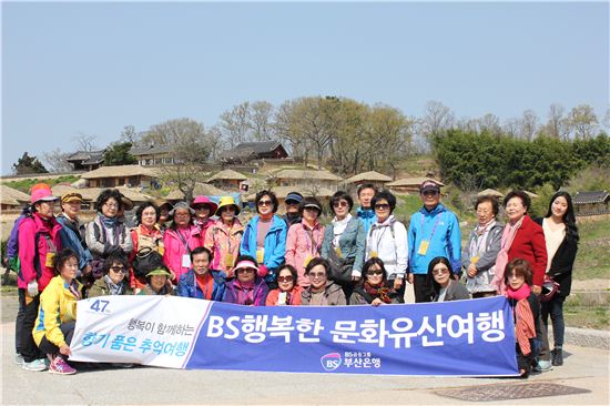 [아시아경제 조은임 기자] 부산은행은 거래고객 40여명과 경주양동 한옥마을에서 ‘BS행복한 문화유산여행’을 실시했다고 8일 밝혔다고객 사은 행사의 일환으로 실시한 ‘BS행복한 문화유산여행’역사전문가가 동행, 스토리텔링 방식으로 유적지의 역사적 의미를 설명하는 방식으로 참여 고객들의 만족도가 높다. 부산은행은 지난 3월 ‘새봄맞이 봄 향기를 찾아서’라는 테마로 하동 쌍계사 매화축제를 다녀온 데 이어 이번 경주양동 한옥마을과 기림사로, 또 오는 5월에는 효도관광을 계획하고 있다. 조은임 기자 goodnim@asiae.co.kr<ⓒ세계를 보는 창 경제를 보는 눈, 아시아경제(www.asiae.co.kr) 무단전재 배포금지>