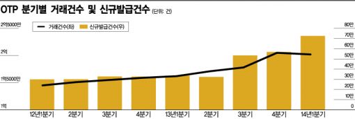 [아시아경제 김철현 기자] 올해 대규모 개인정보 유출 사태로 인해 2차 피해에 대한 우려가 높아지면서 '일회용 비밀번호 생성기(OTP)' 사용자가 크게 증가한 것으로 나타났다. 특히 각 은행들이 최근 보안카드 등 2등급 보안매체의 이체한도를 대폭 축소하면서 OTP 발급이 빠르게 늘고 있다. OTP는 2007년 6월 도입 이후 7년 만에 발급건수 1000만 건을 목전에 두고 있다.14일 금융보안연구원에 따르면 지난달까지 발급된 OTP는 약 944만3000개로 지난해 3월 말과 비교했을 때 215만개 증가했다. 지금까지는 분기별로 최대 50만개가 증가하는 수준이었지만 올해 들어서는 1분기에 72만6000개의 신규 발급이 이뤄질 정도로 증가세가 가파르다. 한 분기에 70만 개 이상의 발급이 이뤄진 것은 처음 도입된 2007년 3분기(75만4000건) 이후 처음이다. 이에 따라 OTP 사용자는 2분기 중으로 1000만 명을 넘어설 것으로 전망된다.OTP를 이용한 거래건수도 지난 1분기에 2억195만7000건으로 집계됐다. 지난해 4분기 2억551만7000건을 기록하며 분기별 이용건수 2억 건을 넘어선 후 지속적으로 활발하게 사용되고 있는 셈이다. 누적 거래건수는 31억8086만 건이다.