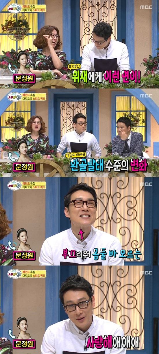 [아시아경제 장용준 기자]방송인 이휘재가 12일 오후 방송한 MBC 예능프로그램 '세바퀴'에서 아내와 전화 통화를 하며 평소와 전혀 다른 수줍어하는 모습을 보였다. 이날 이휘재는 '스피드 퀴즈'를 위해 아내 문정원에게 전화를 걸었다. 그런데 왠지 위축돼 보이는 그의 얼굴이 출연진에게 놀라움을 안겨줬다.알고 보니 호탕한 성격의 이휘재도 아내 앞에서는 순한 한 마리 양과 같았던 것이다. 주위의 동료들은 총각 시절과 비교해 그의 달라진 모습에 대해 말문을 열었다.출연진은 문정원에게 부부금슬에 대한 짓궂은 질문을 계속 던졌고, 이휘재는 부끄러움에 얼굴이 붉어졌다.이후 그는 퀴즈를 모두 끝내고 "이따 들어갈게, 사랑해"라는 낭만적인 한 마디로 아내에 대한 마음을 표현, 훈훈함을 자아냈다. 장용준 기자 zelra@asiae.co.kr<ⓒ세계를 보는 창 경제를 보는 눈, 아시아경제(www.asiae.co.kr) 무단전재 배포금지>