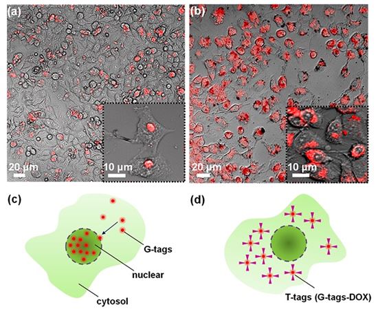 ▲탄소나노입자에 항암치료제인 DOX를 결합해 주입한 암세포 이미징.[사진제공=한국기초과학지원연구원]<br />