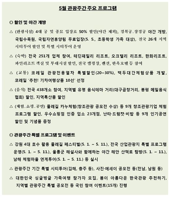 [아시아경제 이규성 기자] 5월은 가정의 달이다. 이번 5월은 어린이날(5일), 석가탄신일(6일) 등 황금연휴가 이어져 가족과 함께 여행하기에 안성맞춤이다. 이에 정부가 국내 관광 활성화에 발 벗고 나섰다. 정부는 오는 5월1∼11일 '관광주간'으로 첫 지정하고 근로자 휴가 사용 장려 및 지원, 각급 학교 자율휴업을 유도하기로 했다. 특히 이 기간 전국 1168개 관광관련업소가 할인행사에 들어가며 궁궐 등 주요 관광지 야간 개방 연장, 107개 특별관광 프로그램 및 여행 상품이 운영된다. ◆국내 관광 수요 창출 '절실'= 15일 문화체육관광부는 '2014 관광주간'을 지정하고, 하계휴가 분산, 가족 여행 확대 등으로 내수경제 활성화를 위한 각종 프로그램 및 이벤트 계획을 내놓았다.현재 영국, 미국, 중국, 일본 등 해외 각국도 관광주간과 같은 유사한 형태를 통해 국민의 여가활동을 독려하고 있다. 영국의 경우 3∼5월, 미국 5월 중 1주, 일본 4월 말, 중국 황금주를 포함, 1∼2월(춘제), 10월(국경절)에 관광주간을 두고 있다. 중국은 황금주의 관광수입이 관광시장 연간 수입의 25%를 차지하고 있으며 일본은 골든위크 시행 이후 1인당 숙박여행 1.2일, 여가 지출액 2조2000억엔이 증가한 것으로 나타났다. 관광주간이 실시된 배경은 국내 관광 수요 및 지역경제 활성화, 휴가 분산, 관광수지 적자, 해외 관광 확대 등과 관련 있다. 국내 관광여행은 지난해 기준 월별 비중으로 5월 8.7%, 9월 5.7%로 최대 성수기인 7월 14.1%, 8월 20.7%에 비해 매우 낮은 편이다. 따라서 관광주간 실시로 5월 휴가 사용을 장려, 하계 성수기에 집중돼 온 여행 수요를 분산할 필요성이 제기돼 왔다. 이에 다양한 할인 및 프로그램을 이용해 값싸고 실속 있는 국내 여행을 다녀올 수 있는 환경이 조성됐다. ◆각종 시설 할인 및 교통편 확대= 이에 따라 정부는 관광주간에 맞춰 대대적인 할인행사 및 특별 프로그램 운영, 각종 장려책을 실시한다. 우선 할인 행사로 ▲숙박 251개 ▲음식 438개 ▲관광시설 247개 ▲체험·시티투어 147개 ▲쇼핑·공연 85개 등 총 1168개의 관광업소가 참여한다. 더불어 4대궁 및 종묘 입장료 50% 할인(야간 제외) 및 야간 개방, 국립수목원·국립자연휴양림 무료 입장(5월5일), 전국 26개 지역 시티투어 할인 및 특별 시티투어(김해·충주 등)를 운영한다. 추천여행 상품 코너를 통해 관광주간 기획 상품 30개가 할인되며 한국관광협회는 '추천 내나라 여행상품', 한국여행협회는 우수 여행상품 10선을 내놓는다. 민간에서는 위메프, 롯데마트, 호텔엔조이, 여행박사 '세일투나잇'은 관광주간 특별 할인전 및 상품기획전을 진행한다. 특별 프로그램으로 ▲강원 4대 호수 활용 물레길 페스티벌 ▲전국 산업관광지 특별 프로그램 운영 ▲울릉군 해설사와 함께하는 야간 해안 산책로 탐방 ▲남해 체험마을 연계 투어 등을 실시한다. 더불어 ▲대한민국 싱글벙글 가족여행 ▲사진 및 에세이 공모전 ▲봄이 아름다운 한국관광 추천하기 ▲지역별 관광주간 특별공모전 등 15개 이벤트도 진행된다. 숙박의 경우 전국 251개 업체가 참여한다. 테딘패밀리 리조트, 오크밸리 리조트, 한화리조트, 파인리조트 등 전국 238개 숙박업체, 베니키아호텔, 굿스테이, 한옥스테이, 전국 캠핑장, 펜션, 한옥호텔 등이 할인에 나선다.이 기간 교통편도 대폭 확대된다. 우선 KTX 증편(54회·4만554석), 관광주간 중 임시관광열차 36회 운행, 관광전용열차 운임 할인 등을 실시하고, 시외버스 예비차량 116대, 전세버스 500여대 및 항공기 증편(전년 대비 8.4%·1717편) 등을 추진한다. ◆근로자 휴가 지원 등 관광 장려= 이어 정부는 가족여행을 떠날 수 있는 여건 조성을 위해 ▲관광주간 내 휴가 사용 장려 ▲올해의 관광도시(통영·무주·제천) 포함, 전국 초·중·고교 자율휴업 유도 ▲근로자 휴가지원 등을 실시할 계획이다.초·중·고 휴업과 관련, 통영 20개교, 무주 2개교, 제천 27개교에서 시범 자율휴업을 진행하고, 자율휴업 학생 대상(3600명) 여행지도사를 파견하며 올해의 관광도시 소재 학생 및 가족 참가자 600명을 모집해 학습여행을 펼친다. 또 전국경제인연합회, 중소기업중앙회, 대한상공회의소 등 경제 6단체를 통해 근로자 휴가 사용 장려를 요청하고, 올해 근로자 휴가 지원사업을 통해 중소기업·중견기업 근로자 휴가비를 지원(1인당 10만원·121개사·2470명)한다. 이와 별도로 관광주간과 관련, 각 부처 장관 및 기업 대표들도 춘계 휴가를 실시한다. 현재 문화체육관광부는 장차관 및 기업대표들에게 휴가 실시를 요청하는 공문을 발송, 협조를 유도하고 있으며 각 부처도 현장밀착형 휴가를 실시하는 방안을 검토 중이다. 김기홍 문체부 관광국장은 "전 국민이 휴가 하루를 늘리면 소비 2조5000억원, 일자리 5만개가 창출된다"며 "관광주간은 오는 2017년 국내 관광 매출 30조원 달성 등을 위한 발판이 될 것"이라고 말했다. 한편 이번 관광주간에는 23개 정부 부처 및 공공기관, 전국 244개 지자체(광역 17개·기초 227개), 5개 관광협회, 4개 민간업체가 참여한다. 자세한 내용은 관광주간 홈페이지(spring.vistkorea.or.kr)를 참고하면 된다. 홈페이지에서는 할인내용(할인 쿠폰 출력 가능), 주요 행사 