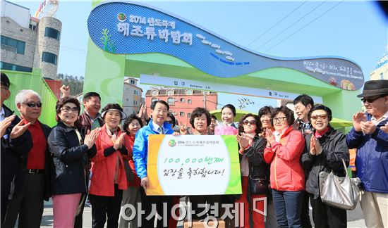 “개장 닷새째인 15일 오전 9:40분 10만명째 입장”[아시아경제 김승남 기자]개막 5일째를 맞고 있는 2014완도국제해조류박람회 관람객 10만명을 돌파해 70만명 유치목표에 탄력을 받고 있다.박람회조직위에 따르면 15일 오전 09:40분 10만번째 관람객이 입장했다고 밝혔다. 10만번째 입장 관람객은 인천시에 거주하는 배금숙(57세)씨이며 박람회조직위는 안마기와 요트승선권을 행운의 기념품으로 증정했다.인하대학교경영대학원 동기생 부부동반모임 일행과 14일 해남 땅끝마을에서 숙박하고 아침 일찍 박람회장을 찾아와 뜻밖의 행운을 잡은 배금숙씨는 기쁨을 감추지 못했다.해조류박람회조직위는 완도를 찾는 관광객들이 특별한 추억과 좋은 이미지를 가질 수 있도록 박람회장을 찾는 관람객을 대상으로 매일 특별한 이벤트를 준비하고 있다.매일 생태환경관은 첫번째 입장객, 건강식품관은 2014번째 입장객, 산업자원관은 5,000번째 입장객을 매일 선정하여 푸짐한 경품을 증정하고 있다.또한, 박람회장 30만번째, 50만번째, 70만번째 입장객에 대한 푸짐한 경품행사를 준비하여 행운의 주인공을 기다리고 있다.박람회조직위는 일일 최대 관람객은 평일 2만2천명, 휴일 4만5천명으로 설정하고 관광객 맞이에 만반의 준비를 하고 있다.김승남 기자 <ⓒ세계를 보는 창 경제를 보는 눈, 아시아경제(www.asiae.co.kr) 무단전재 배포금지>