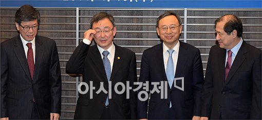 [아시아경제 윤동주 기자] 16일 서울 서초구 팔레스호텔에서 열린 방송통신위원장과 통신3사 조찬 간담회가 열렸다. 간담회에 참석한 하성민 SKT 사장(왼쪽부터), 최성준 방통위원장, 황창규 KT회장, 이상철 LG유플러스 부회장이 기념 촬영을 하고 있다.윤동주 기자 doso7@asiae.co.kr<ⓒ세계를 보는 창 경제를 보는 눈, 아시아경제(www.asiae.co.kr) 무단전재 배포금지>