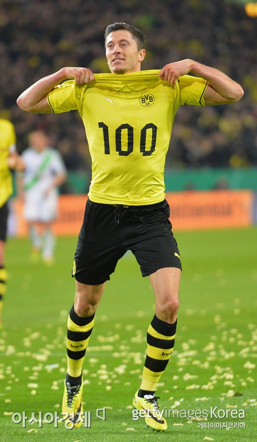 [아시아경제 김흥순 기자]보루시아 도르트문트의 간판 공격수 로베르트 레반도프스키(26)가 독일 무대 통산 100호 골을 기록했다. 레반도프스키는 16일(한국시간) 홈구장 지그날 이두나 파크에서 열린 볼프스부르크와의 독일축구협회컵(DFB 포칼) 준결승에서 쐐기 골을 넣어 2-0 승리와 함께 결승 진출을 이끌었다. 전반 43분 마르코 로이스(25)의 패스를 왼발 슛으로 마무리했다. 득점을 성공시킨 레반도프스키는 유니폼 상의를 들어 올리는 세리머니를 했다. 속옷에는 '100'이라는 숫자가 적혀 있었다. 도르트문트에서 통산 100번째 골을 넣은 기념 뒤풀이였다. 레반도프스키는 2010년 도르트문트에 입단한 뒤 네 시즌 만에 의미 있는 기록을 남겼다. 분데스리가(71골)와 유럽축구연맹(UEFA) 챔피언스리그(17골), 유로파리그(1골), DFB 포칼(10골), 독일축구리그(DFL) 슈퍼컵(1골)에서 득점했다. 2011-2012시즌 리그 득점 3위(22골), 지난 시즌 2위(23골)에 이어 올 시즌은 17골로 마리오 만주키치(28·바이에른 뮌헨)와 공동 선두다. 레반도프스키는 이번 시즌을 마치고 바이에른 뮌헨으로 이적한다. 이미 정규리그와 UEFA 챔피언스리그 우승경쟁에서 밀려 DFB 포칼 우승이 중요해졌다. 결승에 먼저 진출한 도르트문트는 다음달 18일 바이에른 뮌헨-카이저슬라우테른 승자와 우승컵을 놓고 격돌한다. 김흥순 기자 sport@asiae.co.kr<ⓒ세계를 보는 창 경제를 보는 눈, 아시아경제(www.asiae.co.kr) 무단전재 배포금지>