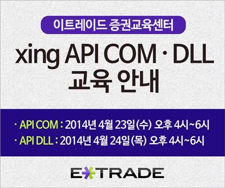[아시아경제 이현우 기자]이트레이드증권은 오는 23일과 24일 이틀간 여의도 사학연금회관 10층 이트레이드증권 교육장에서 '애플리케이션 프로그램 인터페이스(API) COM 및 API DLL 교육강좌'를 진행한다고 16일 밝혔다.API는 응용 프로그램에서 사용할 수 있도록 운영 체제나 프로그래밍 언어가 제공하는 기능을 제어할 수 있게 만든 인터페이스를 뜻한다.증권교육센터 4월 교육 커리큘럼으로 진행되는 이번 강좌는 'xingAPI COM 바로 알기'라는 기초 과정과 'xingAPI DLL 활용'이라는 전문 과정으로 구성돼있다.'xingAPI COM 교육강좌'는 23일 오후 4시부터 API COM에 입문하는 초보자를 위한 기초 교육을 주제로 진은정 이트레이드증권 스마트지원팀 과장이 진행한다. 'xingAPI DLL 교육강좌'는 24일 오후 4시부터 ‘xingAPI DLL 사용하기’를 주제로 오현택 이트레이드증권 스마트지원팀 팀장이 진행한다. 프로그램 개발 언어에 대한 이해가 있으며 C/C++등을 이용한 프로그래밍 경험이 있는 고객에 한해 참석이 가능하다. 각 교육의 참여 가능 인원은 선착순 40명이며 참여고객에게는 교육장에서 수강과 동시에 학습이 가능하도록 1인당 컴퓨터가 1대씩 제공된다. 기타 문의는 이트레이드증권 홈트레이딩시스템(HTS) 씽큐 및 홈페이지(//www.etrade.co.kr), 또는 고객만족센터(1588-2428)를 통해 가능하다.이현우 기자 knos84@asiae.co.kr<ⓒ세계를 보는 창 경제를 보는 눈, 아시아경제(www.asiae.co.kr) 무단전재 배포금지>