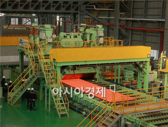 현대제철 당진공장에서 작업자들이 후판 생산 공정을 확인하고 있다. [사진제공=현대제철]