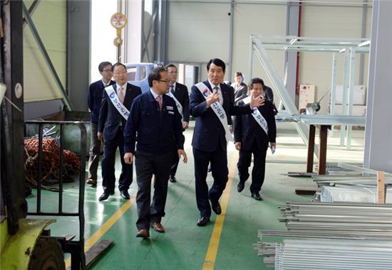 ▲성세한 BS금융그룹 회장은 22일 '생생데이'를 맞아 구평동에 소재한 해인산업을 직접 방문해 현장을 둘러보고 있다. <br />