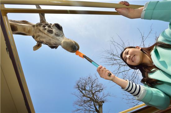 에버랜드 로스트밸리 스페셜투어 나선 한 관람객이 지붕없는 지프에서 기린에게 먹이를 주고 있다