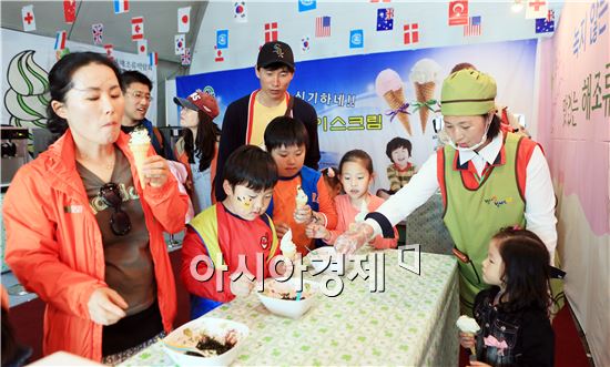 [아시아경제 노해섭 기자]2014완도국제해조류박람회에서 다양한 체험프로그램이 운영되고 있는 가운데 녹지않는 해조류아이스크림 체험 프로그램이 큰 인기를 끌고 있다.녹지 않는 해조류아이스크림은 박람회 체험프로그램을 운영하기 위해 일본에서 기술을 전수하여 운영하고 있으며 박람회장에서 관람객들이 직접 시식하는 체험프로그램이다.아이스크림은 해조류 등 각종 재료를 사용하여 제조하며 상온에서(15-25℃) 일반 아이스크림보다 약 40분 이상 녹지 않는 신기한 아이스크림으로 알려져 있다.아이스크림 체험프로그램은 매일 9시부터 오후 5:50분까지 1회당 10명씩 신청 받아 총 52회를 운영하며 참가비는 1,000원씩이다.개장일인 11일부터 13일 동안 4,519여명이 아이스크림 체험 프로그램에 참여했다. 또한, 일본에서 기술을 전수한 해조라면, 해조국수 체험 프로그램도 큰 인기를 끌고 있다.해조류박람회 조직위 관계자는 “녹지 않는 해조류 아이스크림에 사용하는 재료나 제조기술은 외부 비공개를 원칙으로 일본과 기술제휴 관계로 체험장에서 자세한 제조기술을 밝힐 수 없음을 양해바란다”고 말했다.한편, 5월 11일까지 관람객 70만명 유치를 목표로 하고 있는 해조류박람회 누적관람객은 23일 현재 약 25만 6천명이 입장한 것으로 나타났다.노해섭 기자 nogary@<ⓒ세계를 보는 창 경제를 보는 눈, 아시아경제(www.asiae.co.kr) 무단전재 배포금지>