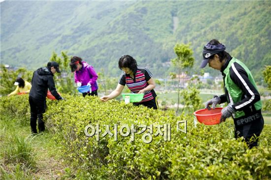 해남군이 두륜산 녹차 밭을 개방하자 관광객들이 녹차따기 체험을 하고있다.