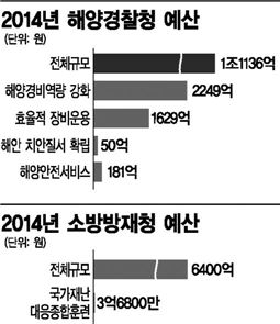 정치권은 이러한 문제점들을 알았지만 해양경찰청 예산을 그대로 승인했다. 국회가 통과시킨 2014년 예산안 원안을 보면 해양경찰청 총 예산 규모는 1조1136억원, 해상 경비 및 안전활동에 대해 341억원(해양 안전 서비스 181억원 포함)으로 예비심사검토보고서 책정 결과와 같았다. 세월호와 같은 대형재난상황에서 구조작업에 대한 예산이 턱없이 부족한 것을 알았지만 수정없이 통과시킨 것이다. 국회 관계자는 "예산안 심사 당시 독도나 이어도 등에 대한 중국 어선의 불법조업 단속 등이 이슈여서 해양안전과 재난에 대한 검토가 잘 이뤄지지 않았다"며 "의원들이 예산안 심사를 할 때는 자신의 지역구에 관련된 것이나 최근 이슈에 대해서 신경쓰기 때문에 안전에 대한 예산이 중요하게 다뤄지기 쉽지 않다"고 밝혔다. 2014년 예산심사 과정 중 '안전 예산'에 대해 지적을 받았지만 그대로 통과된 곳은 해양경찰청 뿐만이 아니다. 소방방재청에 대한 2014년 예산안 예비심사검토 보고서에는 '국가재난대응종합훈련' 규모에 대해 검토가 필요하다고 명시돼 있다. 국가재난대응종합훈련은 '재난 및 안전관리기본법'에 의해 매년 400개 이상의 행정기관이 참여하는 대규모 종합훈련이다. 소방방재청은 2014년 예산에서 3억6800만원을 종합훈련에 책정했다. 지난해보다 1억7600만원 늘어난 액수다. 세부적인 항목을 들여다보면 TV광고료에 1억원, 연구개발비가 6000만원이 각각 증액됐다. 보고서는 6000만원 연구개발비 부분에 대해 "편성요건에 부합하는지의 여부에 대한 면밀한 검토가 필요한 것으로 보여진다"고 평가했다. 세월호 침몰에 가장 큰 원인이 된 '선박 평형의 관리'와 관련된 예산도 정치권이 책임에서 자유롭지 못할 것으로 보인다. 지난해 해양수산부는 2014년 예산에 선박운송 안전확보 항목 중 선박평형수관리에 5억원을 배정했다. 그러나 해양수산부가 예산에 편성한 선박평형수 관리 사업은 선박 안전에 대한 것이 아니라 선박평형수를 배출할 때 발생할 수 있는 생태계 파괴를 예방하는 예산이었다. 이에 대해 예산안예비심사보고서는 "'선박평형수관리' 예산이 생태계 교란을 방지하기 위한 것이므로 '선박운송 안전확보' 사업과는 거리가 있다"며 "세부 사업을 별도로 편성해 추진할 필요가 있다"고 지적했지만 정치권은 이를 묵인했다. 전슬기 기자 sgjun@asiae.co.kr<ⓒ세계를 보는 창 경제를 보는 눈, 아시아경제(www.asiae.co.kr) 무단전재 배포금지>