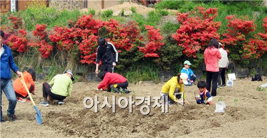 장성군이 주말 텃밭 체험농장을 개장했다. 주말을 맞아 주민들이 텃밭에서 밭을 일구고 있다.