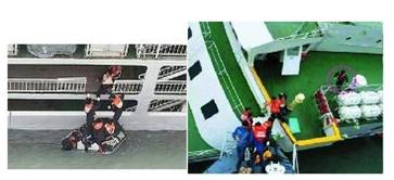 ▲16일 오전 9시30분께 해경이 침몰하고 있는 세월호에 접근해 구조활동을 벌이고 있다.
