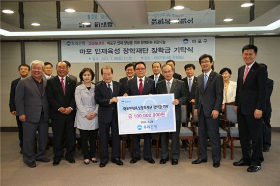 [아시아경제 박종일 기자]마포구(구청장 박홍섭)는 29일 우리은행과 마포인재육성장학재단 장학금 1억원 기탁식을 가졌다. 기탁식에는 박홍섭 구청장, 권오범 장학재단 이사장, 우리은행 권기형 부은행장 등이 참석하였다.우리은행은 어려운 환경 속에서도 배움의 뜻을 가진 학생들에게 용기와 희망을 주고 지역발전에 이바지할 인재 양성에 보탬을 주기 위해 이번 장학금 1억원을 기탁한다는 뜻을 밝혔다. 박홍섭 구청장은“우리은행의 오늘 장학금 1억원은 세월호 사건으로 전 국민이 슬퍼하고 낙담하고 있는 이 시기에 청소년들의 미래를 위한 투자며 희망을 나누는 것이며 마포인재육성장학재단의 종자 돈 역할을 훌륭하게 할 것이라 확신한다”라며 감사의 뜻을 전했다. 권오범 장학재단 이사장은 우리의 미래인 청소년들을 위해 큰 돈을 아낌없이 내놓는 우리은행에 감사드리며 온갖 정성을 기울여 장학사업을 추진하겠다”고 감사 인사를 전했다.박종일 기자 dream@asiae.co.kr<ⓒ세계를 보는 창 경제를 보는 눈, 아시아경제(www.asiae.co.kr) 무단전재 배포금지>