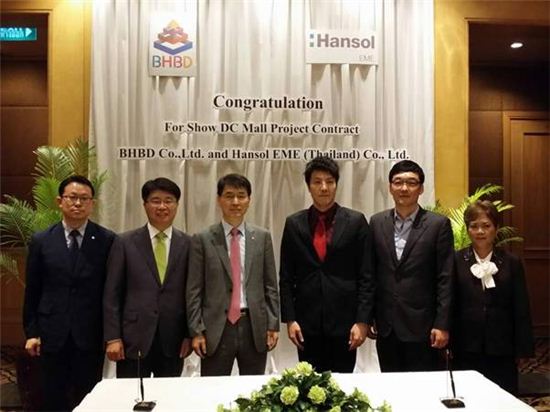(왼쪽부터)최두회 한솔이엠이 대표(왼쪽 세번째)가 BHBD 관계자(왼쪽 네번째)와 계약식 후 기념촬영을 하고 있다.<br /> <br />