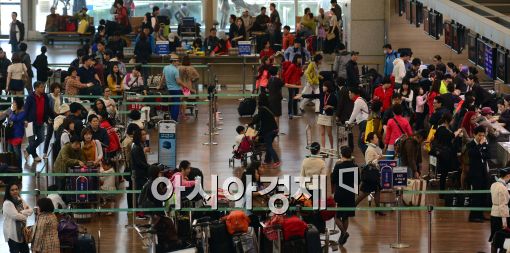 [영종도=아시아경제 최우창 기자]세월호 침몰 사고로 온 국민이 희생자를 추모하는 분위기 속에서도 30일 인천국제공항에서 5월 초 황금연휴 기간을 맞아 해외여행을 떠나는 사람들로 붐비고 있다.인천공항 관계자에 따르면 30일부터 다음 달 6일까지 7일간 인천공항 이용객이 2001년 개항 이후 가장 많은 90만명을 기록할 전망이며 이는 지난해 같은 기간(66만6000명)보다 35% 이상 많은 수치라고 밝혔다.최우창 기자 smicer@asiae.co.kr<ⓒ세계를 보는 창 경제를 보는 눈, 아시아경제(www.asiae.co.kr) 무단전재 배포금지>