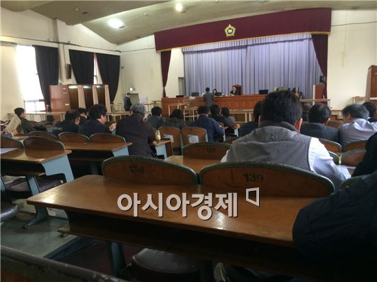 경매 입찰이 진행되고 있는 서울중앙지법 경매법정 내부 모습.