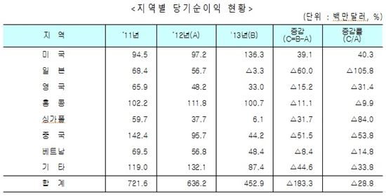 점포수는 늘었지만 수익성은 악화됐다. 지난해 국내은행 해외점포의 당기순이익은 4억5000만달러로 전년 6억4000만달러 대비 28.8%(1억8000만달러)나 감소했다. 금감원은 부실여신이 늘면서 충당금 비용이 2억달러에서 4억3000만달러로 크게 늘고 저금리 기조에 따른 순이자마진율(NIM) 축소 등으로 이자이익이 줄어든 영향이라고 설명했다. NIM은 2011년 말 2%에서 2012년 1.91%, 지난해 1.78%로 꾸준히 축소되고 있다. 총자산수익률(ROA)은 0.64%로 전년 대비 0.32%포인트 하락했지만 국내은행 전체 ROA인 0.21% 보다는 높은 수준이었다. 국내은행과 이들의 해외점포 ROA는 꾸준히 감소추세다. 지역별로는 미국을 제외한 모든 나라에서 순익이 감소했다. 특히 일본은 국민은행 부당대출건으로 330만달러의 순손실을 냈다. 자산규모는 총 778억4000만달러로 전년 대비 88억2000만달러(12.8%)가 늘었다. 이는 대출금이 전년 대비 53억5000만달러(18.2%)나 늘었고 현금·예치금도 18억6000만달러(15.4%) 증가한 영향이다. 국가별로 보면, 중국과 홍콩의 자산규모는 각 46억8000만달러, 11억8000만달러 증가한 반면 일본은 엔화 약세 등의 영향으로 자산규모가 전년 대비 13억5000만달러 감소했다. 부실채권비율은 1%로 전년 보다 0.1%포인트 상승해 자산건전성이 다소 악화된 모습을 보였다. 금감원은 "일본에서의 부당대출과 중국에서의 STX 계열 여신, 베트남·싱가폴에서의 쌍용건설 여신 부실화 등으로 부실채권비율이 상승했다"고 설명했다. 금감원은 5월 중 해외점포 중 리스크에 취약한 점포를 중심으로 경영현황과 리스크관리 실태를 각 은행 자체적으로 집중 점검토록 할 계획이다. 아울러 은행 해외점포에 대한 관리감독과 여신관리 체계를 강화하도록 한 금감원의 지도내용을 철저히 이행하도록 촉구했다. 금감원 자체적으로도 해외점포에 대한 상시감시와 현장검사 기능을 강화하기로 했다. 특히 경영건전성이 취약하거나 현지감독당국의 감독수준이 미흡한 해외점포의 경우에는 현지당국과의 정보공유, 공동검사 등을 활성화하는 등 긴밀히 협력할 계획이다. 김혜민 기자 hmeeng@asiae.co.kr<ⓒ세계를 보는 창 경제를 보는 눈, 아시아경제(www.asiae.co.kr) 무단전재 배포금지>