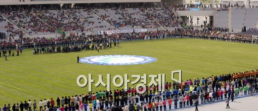 [인천=최우창 기자]7일 인천시 서구 연희동 인천 아시아드 주경기장에서 열린 준공 기념행사에서 송영길 인천시장을 비롯한 관계자들과 시민 등 2014명이 테이프 커팅식 하고 있다.인천시는 범국민적 관심과 참여를 유도하기 위해 테이프커팅에 아시안게임 개최 연도를 상징하는 2014명의 시민과 내·외빈을 초청했다. 최우창 기자 smicer@asiae.co.kr<ⓒ세계를 보는 창 경제를 보는 눈, 아시아경제(www.asiae.co.kr) 무단전재 배포금지>