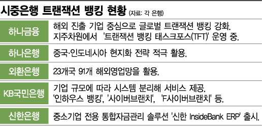 8일 금융권에 따르면 하나금융지주는 '트랜잭션 뱅킹 태스크포스(TFT)'를 운영하고 있다. 연초 2025년까지 수익의 40%를 글로벌 사업에서 얻겠다고 선포한 만큼 하나ㆍ외환은행의 글로벌 트랜잭션 뱅킹 강화에 박차를 가할 방침이다. 하나은행은 기존에 진출해 있는 중국, 인도네시아에서의 '현지화' 전략을 '트랜잭션 뱅킹'에도 적용할 방침이다. 이곳에 진출한 기업에 대해 이체ㆍ송금 등 단순 금융업무는 해외 본사를 둔 기업의 한국지사 감사ㆍ기획 업무에 필요한 데이터도 제공한다. 외환은행은 23개국 91개 해외영업망을 적극 활용할 예정이다. 특히 2012년 설립한 홍콩내 '글로벌 무역금융ㆍ송금센터'를 통해 기업들에 외국환 업무를 지원한다. 외환은행 관계자는 "각 은행에 흩어져 있는 금융정보를 한데 모아 온라인으로 확인할 수 있도록 서비스를 제공하고 있다"며 "이를 통해 기업과 은행간 거래관계를 강화하고 파생 거래를 만들어 낼 수 있을 것"이라고 설명했다.이처럼 '글로벌 트랜잭션 뱅킹'이 부상하는 것은 거래 수수료에 대한 국내외의 인식차에서 비롯된 측면이 크다. 국내에서의 금융거래에 수수료를 부과하는 것에는 저항이 크지만 해외 거래에 대해서는 그렇지 않기 때문이다. 한 시중은행의 e금융부서 관계자는 "트랜잭션 뱅킹의 주 목적은 수수료 획득"이라며 "이 시장을 선점하기 쉬운 해외로 은행들이 눈을 돌리는 건 당연한 이치"라고 말했다. 이와는 달리 국내에서의 '트랜잭션 뱅킹'은 '우량 고객 확보'가 목표다. 이미 국내에서의 기업자금관리 서비스는 대부분의 은행에서 제공하고 있는 만큼 '차별화'에 매진하고 있다. KB국민은행과 기업은행은 소상공인부터 대기업까지 규모에 따라 시스템을 나눠 제공하고 있다. 국민은행은 공공기관ㆍ대기업을 대상으로 '인하우스 뱅킹', 중견기업 '사이버 브랜치', 중소기업 'F사이버브랜치', 소기업 'KB sERP'서비스를 운용 중이다. 신한은행은 지난달 중소기업 전용 통합자금관리 솔루션인 '신한 InsideBank ERP'를 출시했다. 여러 금융기관에 개설된 계좌의 입출금 내용이나 법인카드 승인ㆍ청구 내용을 기업 내부시스템(ERP)과 연동해 한 번에 조회할 수 있는 시스템이다.시중은행 관계자는 "은행들이 수익확보를 위해 예대금리차를 확대하는 것은 한계가 있다"며 "결국 기업금융서비스에서 차별화해 나가는 방향으로 수익원을 다변화해 나갈 수 밖에 없다"고 전했다.조은임 기자 goodnim@asiae.co.kr<ⓒ세계를 보는 창 경제를 보는 눈, 아시아경제(www.asiae.co.kr) 무단전재 배포금지>