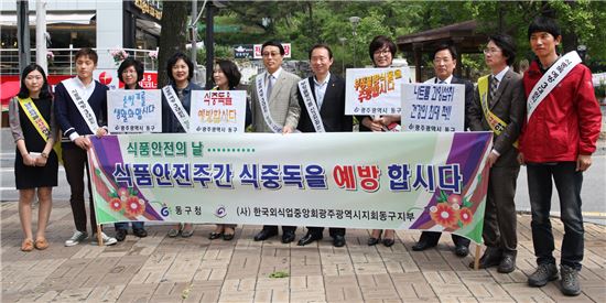 광주광역시 동구가 오는 14일 ‘식품안전의 날’을 맞아 ‘365일 안전한 식품, 건강한 미래’라는 슬로건을 걸고 12일 증심사 유원지에서 담당 공무원과 외식업 영업주들이 가두캠페인을 실시했다.<br />