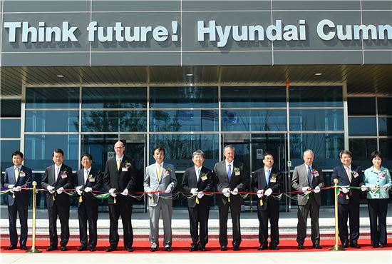 시아경제 김승미 기자]현대중공업과 미국 커민스사가 함께 설립한 '현대커민스엔진유한회사'가 6월부터 건설장비용 엔진 생산을 시작한다. 대구광역시 달성구 테크노폴리스 산업단지에서 12일 열린 현대커민스엔진 공장 준공식에서 이재성 현대중공업 회장과 데이브 크롬턴 커민스 부사장, 김범일 대구광역시장, 최병록 대구경북자유구역청장 등 400여명이 참석했다. (좌측 5번째부터 김범일 대구광역시장, 현대중공업 이재성 회장, 커민스 데이브 크롬턴 부사장, 최병록 대구경북경제자유구역청장 순)김승미 기자 askme@asiae.co.kr<ⓒ세계를 보는 창 경제를 보는 눈, 아시아경제(www.asiae.co.kr) 무단전재 배포금지>