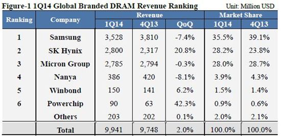 1분기 전체 D램 시장 업체별 매출, 점유율