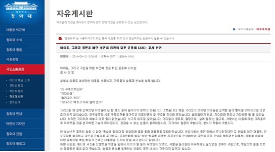 ▲실명 거론한 교사 43명 박근혜 정권 퇴진 운동 선언. (출처: 청와대 홈페이지 글 캡처)