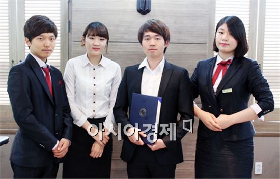 호남대학교 호텔경영학과 이승수(1년), 박혜리(3년), 천태웅(3년), 유연진 씨(1년)[왼쪽부터]가 한국관광공사 주관하는 ‘2014 유스컨벤션(Youth Convention) 공모전’에 입상했다. <br />