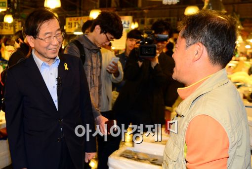 [아시아경제 최우창 기자]출마선언 이후 박원순 새정치민주연합 서울시장 후보가 16일 노량진 수산시장을 방문, 한 상인과 대화를 나누고 있다.최우창 기자 smicer@asiae.co.kr<ⓒ세계를 보는 창 경제를 보는 눈, 아시아경제(www.asiae.co.kr) 무단전재 배포금지>