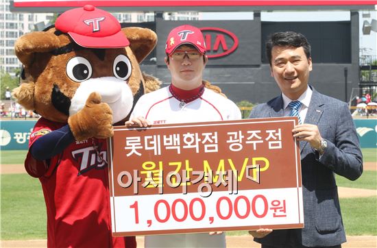 KIA타이거즈 좌완 투수 양현종이 롯데백화점 광주점이 시상하는 4월 월간 MVP에 선정돼 18일 광주 삼성전에 앞서 시상식을 가졌다.<br /> <br /> 양현종은 4월 한 달간 5경기에 선발 등판해 2승 2패 평균자책점 2.73의 뛰어난 성적을 거뒀다.<br /> <br /> 이날 시상은 롯데백화점 광주점 류민열 점장이 했고, 시상금은 100만원이다.