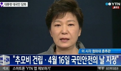 ▲박근혜 대통령이 대국민담화 중 희생자 이름을 부르며 눈물을 보였다. (사진: JTBC 보도화면 캡처)