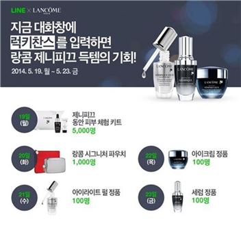 [아시아경제 조유진 기자]네이버(대표 김상헌)는 글로벌 메신저 라인의 공식 이벤트 계정 'LINE 럭키찬스'에서 오는 23일까지 랑콤 화장품을 선물한다고 19일 밝혔다. 라인 이용자들은 이벤트 기간에 LINE 럭키찬스 계정과 친구를 맺는 것으로 랑콤 제니피끄 신제품 체험키트, 파우치 등을 선물로 받을 수 있다. 계정을 친구로 추가하고 대화창에 ‘럭키찬스’를 입력하면 당첨여부를 바로 확인할 수 있다. 이용자들은 이벤트 기간 동안 매일 하루에 한번씩 응모할 수 있다.이벤트 참여자 모두에게는 랑콤 제니피끄 제품 구매시 특별 제공되는 샘플세트 교환 쿠폰과 별도 제작된 랑콤 LINE 럭키찬스 스티커가 무료로 제공된다. 조유진 기자 tint@asiae.co.kr<ⓒ세계를 보는 창 경제를 보는 눈, 아시아경제(www.asiae.co.kr) 무단전재 배포금지>