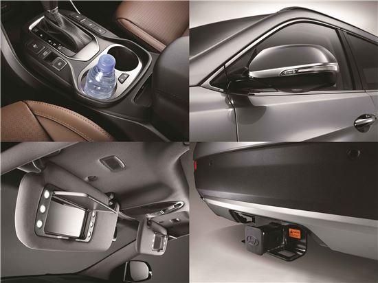 좌측 위쪽부터 시계방향으로 '프리미엄 패키지'에 적용된 냉온 컵홀더, '프리미엄 패키지'에 적용된 크롬 재질로 마감처리 한 사이드미러 커버, '프리미엄 패키지'에 적용된 LED 조명 선바이저,'트레일러 패키지'에 적용된 토우 히치.