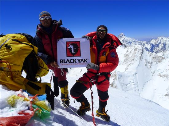 지난여름 가셔브롬Ⅰ정상에서 블랙야크 깃발울 든 김미곤 대장(사진 좌측)