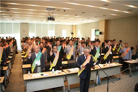 20일 경북 문경의 STX리조트에서 열린 2014년도 협회발전 워크숍에서 대한건축사협회 소속 건축사들이 건축물 안전을 다짐하는 결의문을 낭독하고 있다.<br />