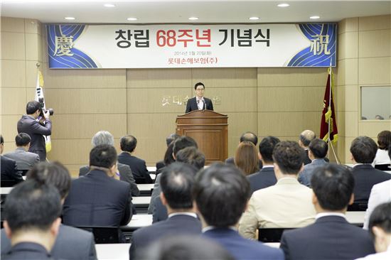 김현수 롯데손해보험 대표이사가 20일 서울 중구 소월로 본사 강당에서 열린 창립 68주년 기념식에서 임직원들에게 격려와 당부의 말을 하고 있다.