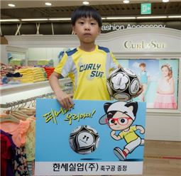 한세실업은 자사의 컬리수 매장에서 당첨된 어린이에게 축구공을 전달하는 행사를 진행했다.