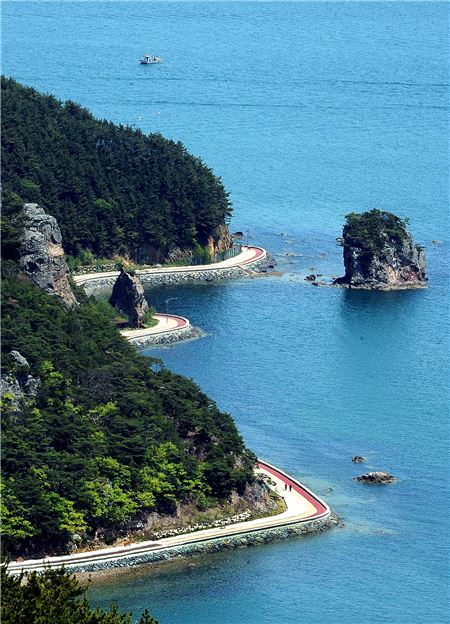 삼칭이 해안로는 바닷가를 따라 길이 나 있다. 해수면과 높이가 거의 같아 바다를 눈높이로 바라보며 걷는 즐거움이 있다. 돛단배 떠다니는 바다가 평온하고 한가롭게 보인다.