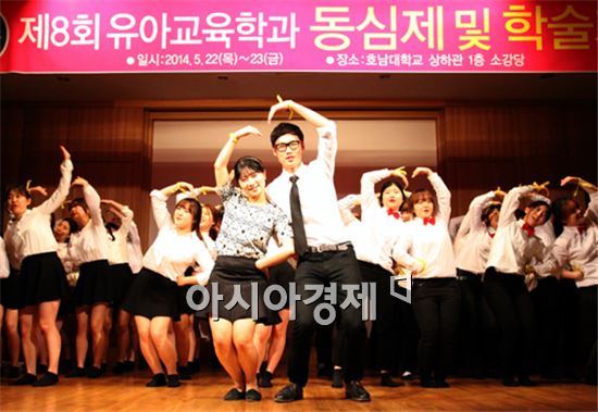 "유아교육학과, ‘환상의 나라’ 주제로 23일까지 이틀간"<br /> "광주지역 20개 어린이집·유치원생 참여 ‘신나는 축제’ "<br /> <br /> 호남대학교 유아교육학과(학과장 채영란)가 22일부터 2일간 광산캠퍼스 상하관 소강당과 잔디광장 일원에서 ‘환상의 나라’를 주제로 ‘제8회 동심제’를 개최했다.<br /> <br /> 22일과 23일 이틀에 걸쳐 광주지역 20여개 어린이집·유치원생 1,200여명을 초청해 열린 이번 행사에서 학생들은 방귀대장 뿡뿡이, 비눗방울, 토마스와 친구들 등의 미동을 실시했다. <br /> <br /> 또 ‘Love is an open door’에 맞춘 합창과, ‘빠빠빠’에 맞춘 화려한 카드섹션을 선보이는 등 유아를 대상으로 한 다양한 공연을 마련했다. 특히 학생MC는 인기 애니메이션의 주인공 ‘엘사’와 ‘올라프’로 변장해 공연을 진행하며 유아들의 흥미를 끌었다.<br /> <br /> 성인관 1층 국제회의실에서는 탱탱볼 만들기, 만화경 만들기, 페이스 페인팅 등의 여러 가지 체험 활동을 마련해 유아들의 창의력 증진과 심미감 발달을 도왔다. 또 ‘나와 가족’, ‘동식물과 자연’, ‘우리동네’, ‘건강과 안전’, ‘교통 기관’ 등 9가지 주제로 4학년 학생들의 졸업 작품과 교구 및 놀이기구 등 유아교육에 필요한 교육 자료들을 전시했다.<br /> <br /> 이날 행사에서 학생들은 유아들의 눈높이에 맞춘 미동과 합창 등을 선보이며 미래 유아교사로서 아이들과 직접 만나 함께 호흡하는 소중한 기회를 가졌다.