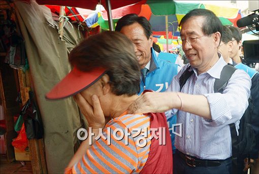 [아시아경제 윤동주 기자] 박원순 새정치민주연합 서울시장 후보가 23일 서울 동대문구 경동시장에서 한 상인의 어깨를 주물러주고 있다.윤동주 기자 doso7@asiae.co.kr<ⓒ세계를 보는 창 경제를 보는 눈, 아시아경제(www.asiae.co.kr) 무단전재 배포금지>